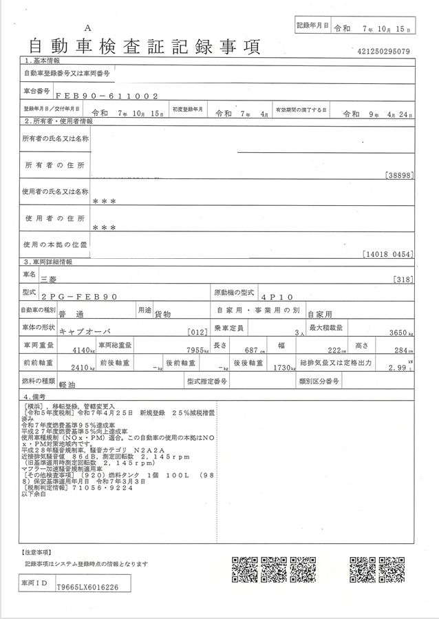 | 初度登録 | 令和7年4月 | 型式 | 2PG-FEB90 |