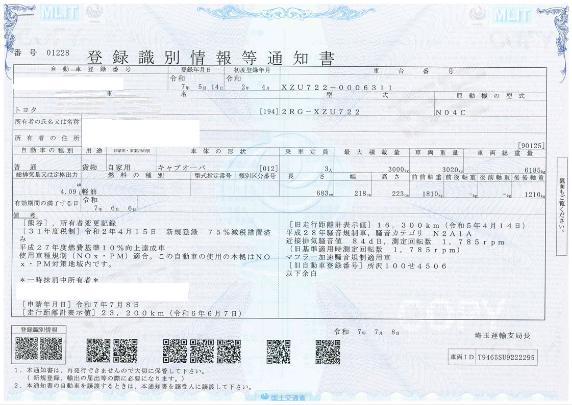 | 初度登録 | 令和2年4月 | 型式 | 2RG-XZU722 |