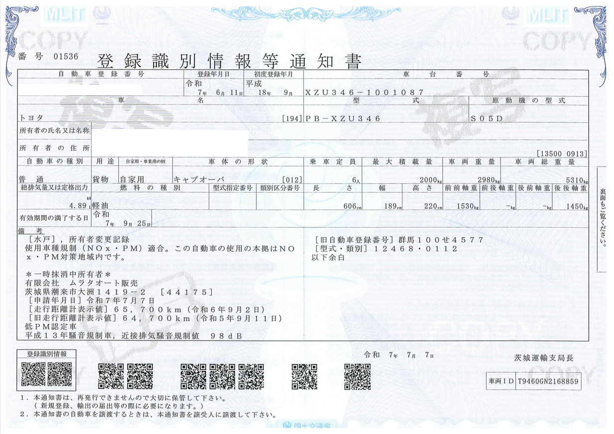 | 車検期間 | 一時抹消 | 走行距離 | 67,000km |
